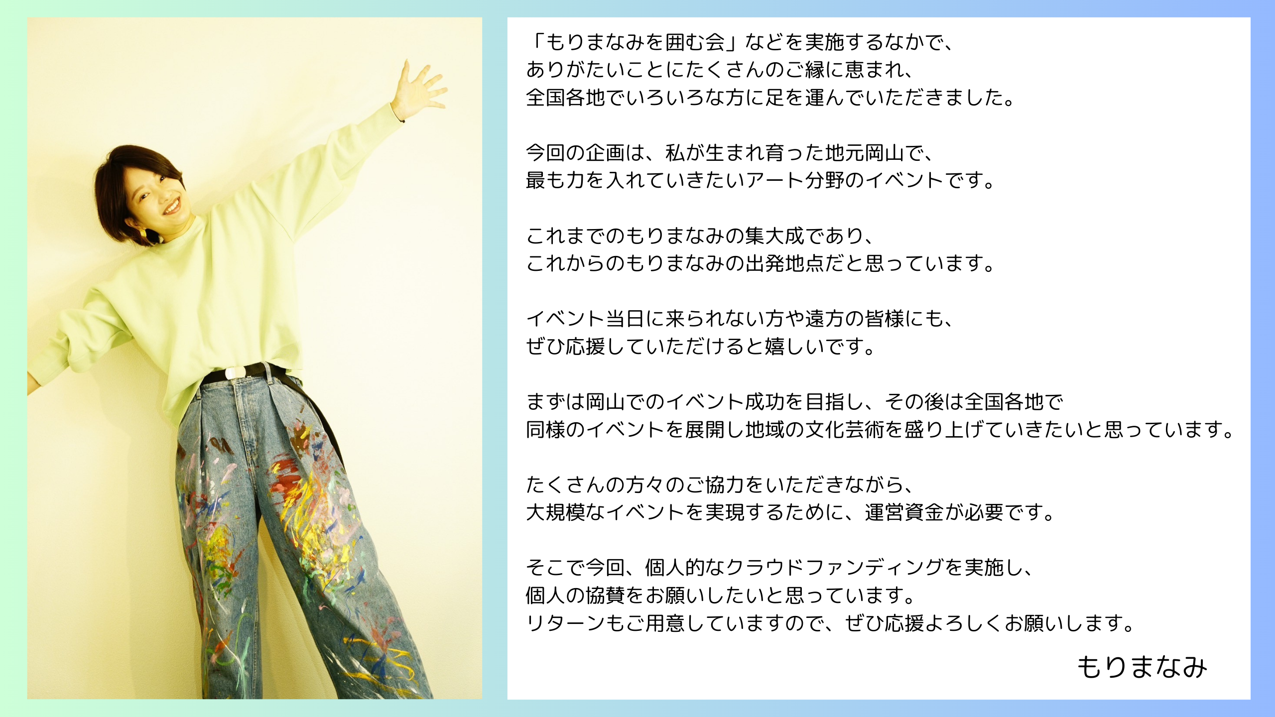 地元岡山出身のアーティスト。謎の交流イベント "もりまなみを囲む会"を全国各地で開催し、200名近く動員。岡山のアートシーン、文化・経済を盛り上げるべく精力的に活動中。